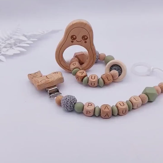 Personalisiertes Baby Geschenkset – Schnullerkette mit Namen & Greifling in Grün – Geschenk zur Geburt & Taufe
