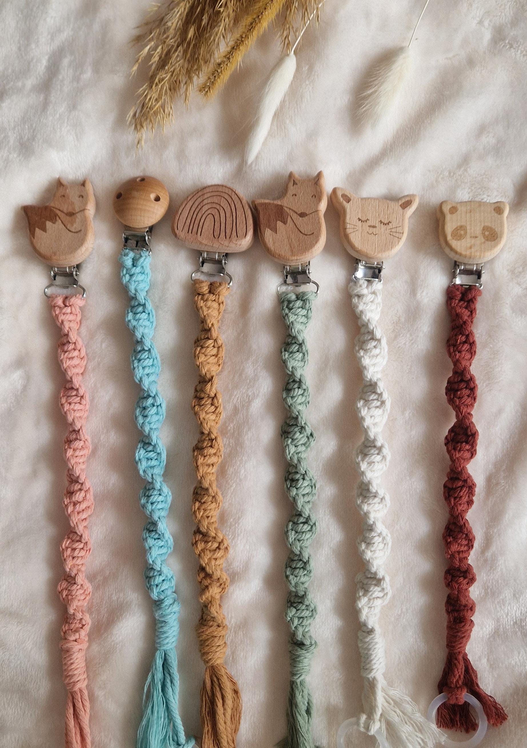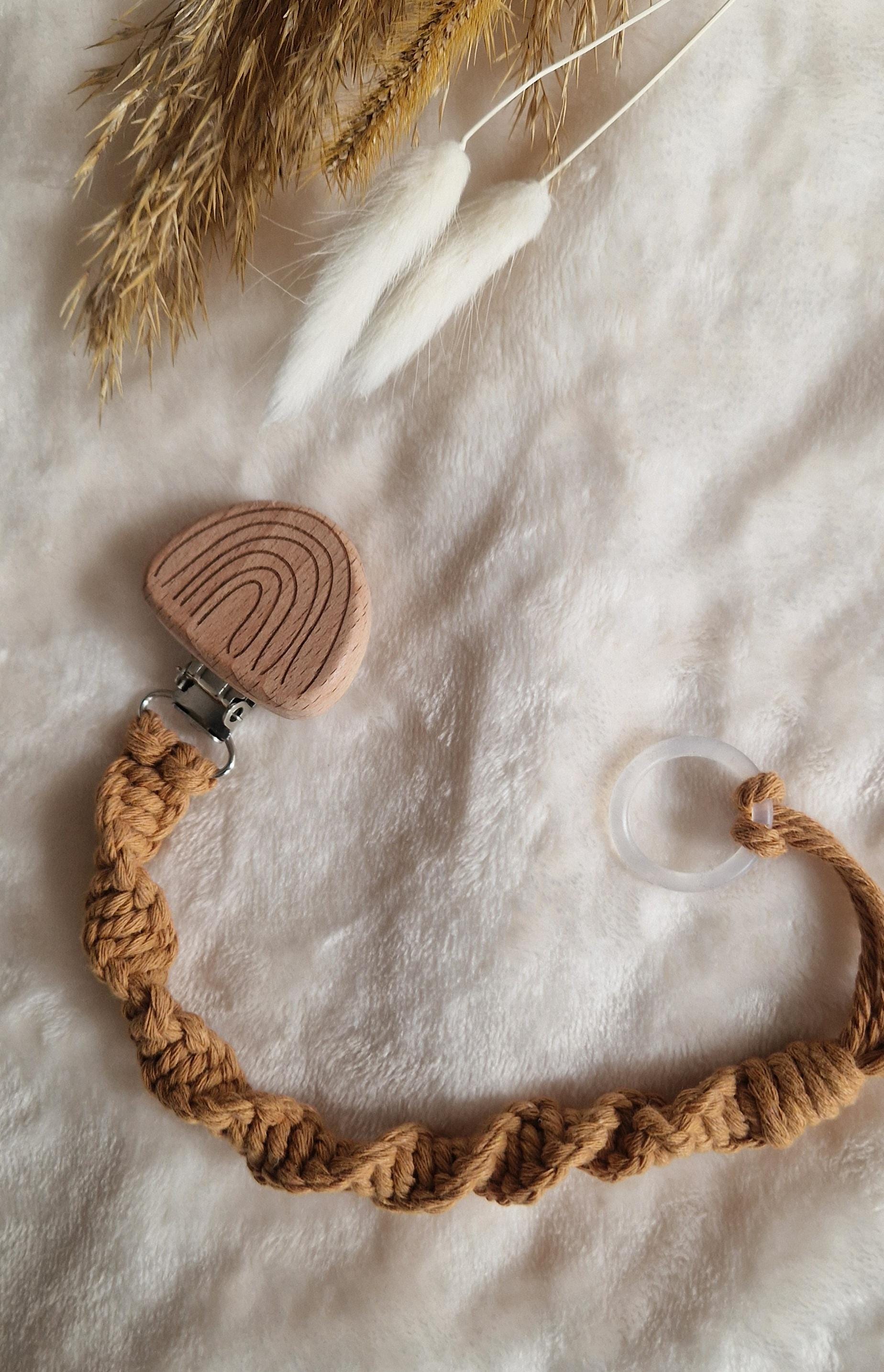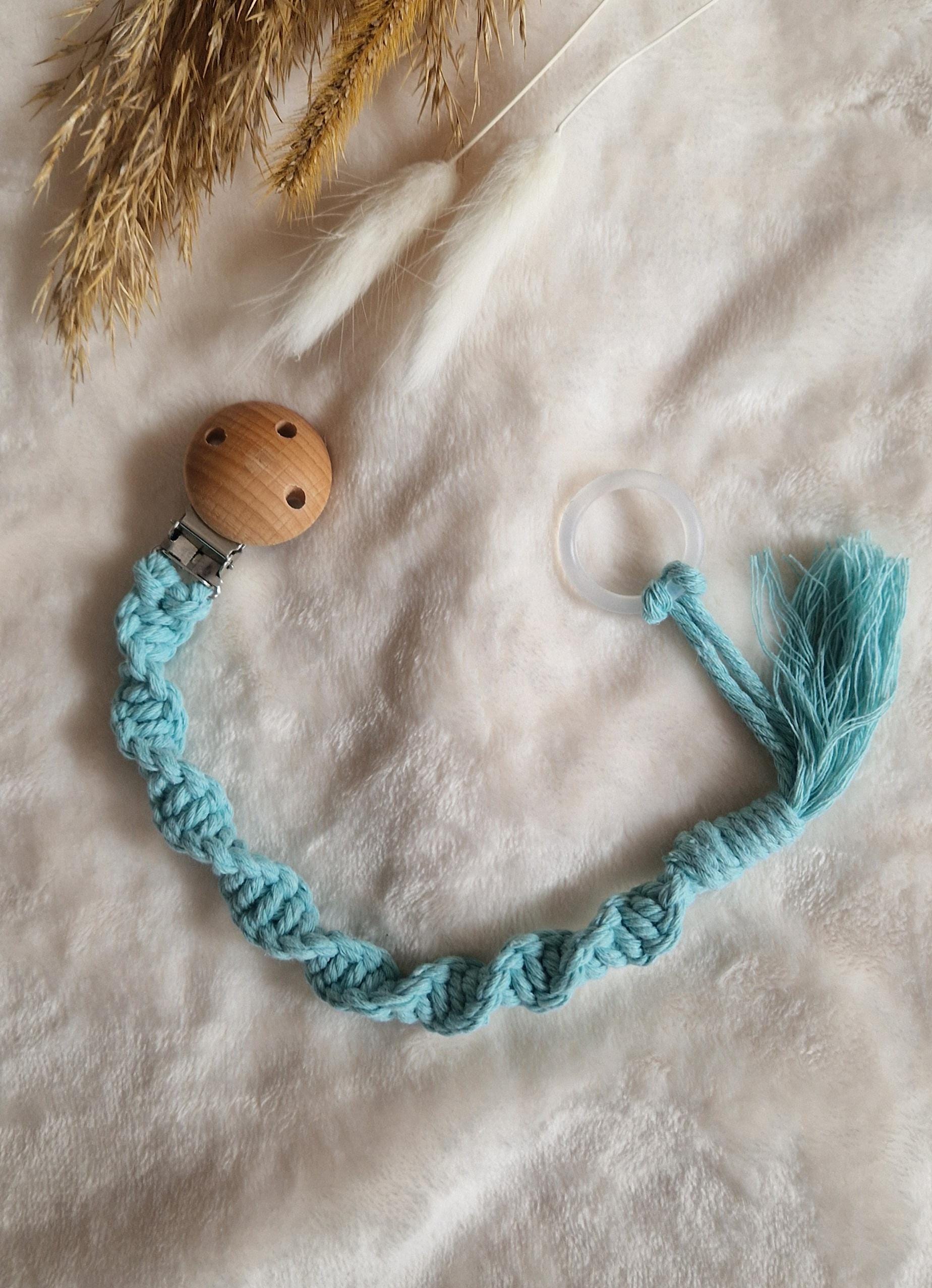 Diese spiralförmige Makramee-Schnullerkette ist ein liebevoll handgefertigtes Accessoire für dein Baby – praktisch, stylisch und absolut im Trend.