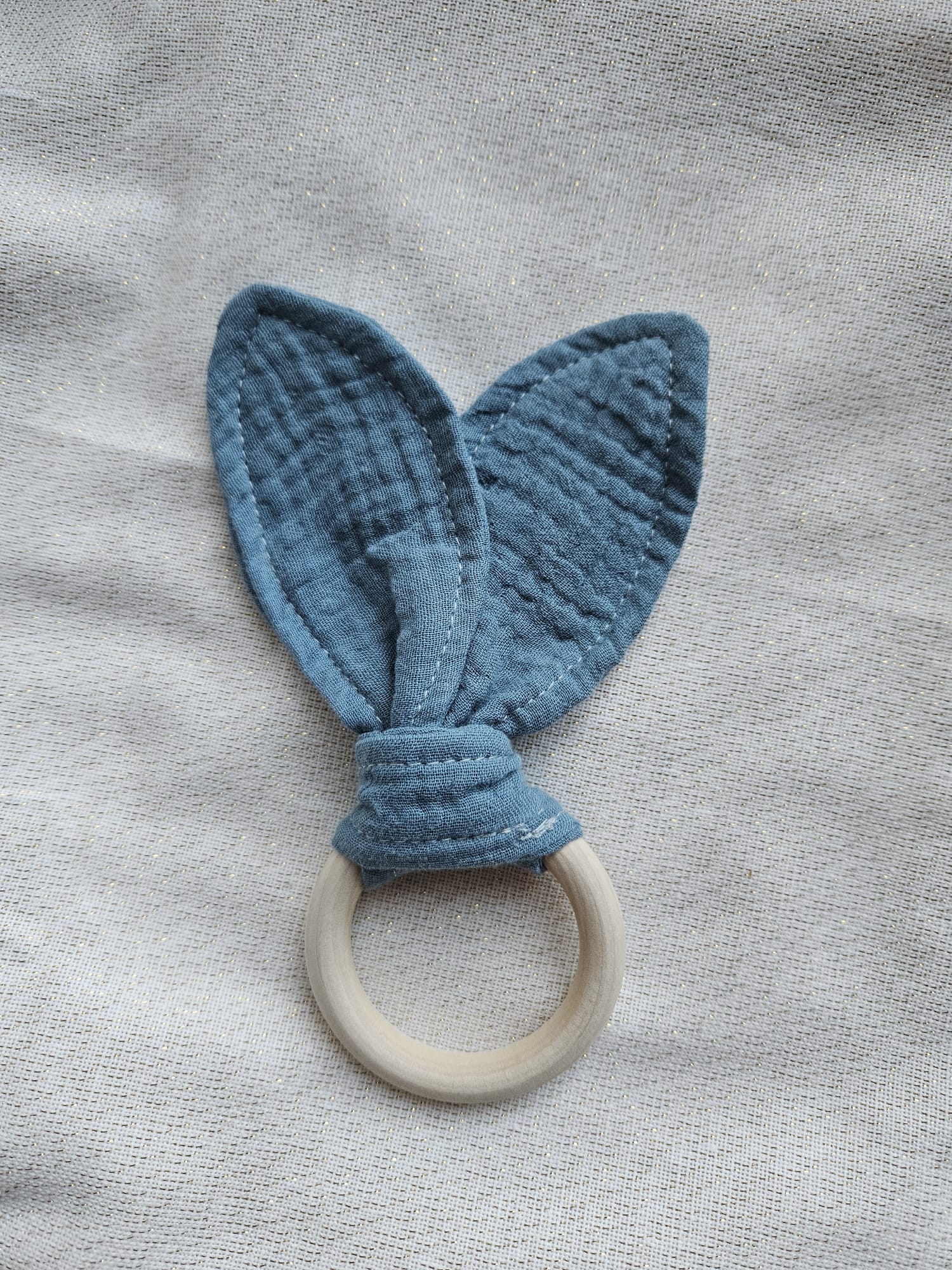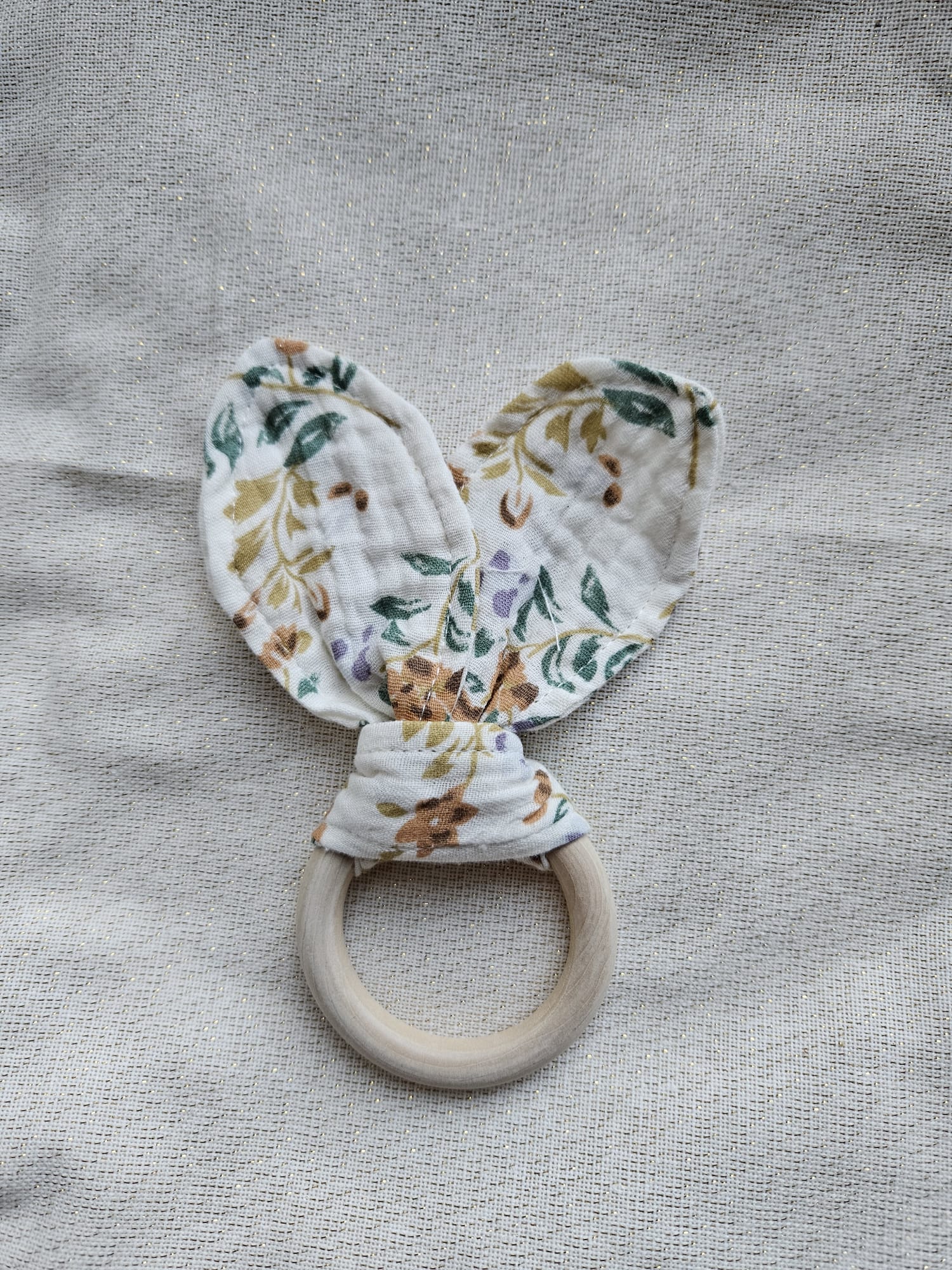 Der natürliche Holzring liegt angenehm in kleinen Babyhänden, während die weichen Musselin-Ohren zum Fühlen, Greifen und Entdecken einladen.