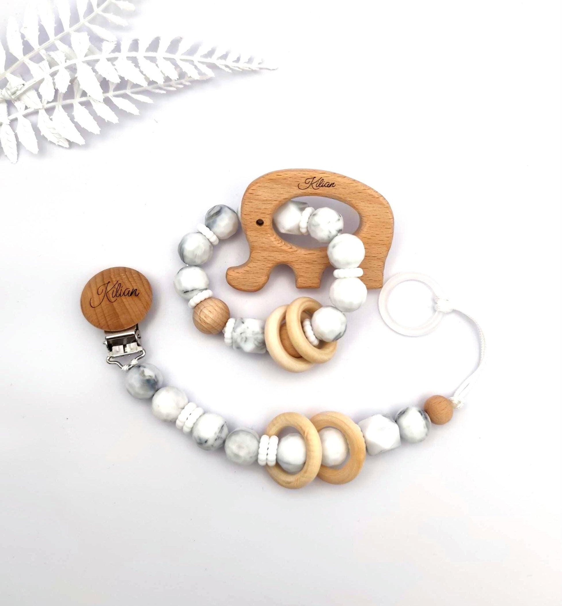 Baby Geschenkset personalisiert mit Gravur – Schnullerkette mit Namen & Greifling in Marmor-Optik