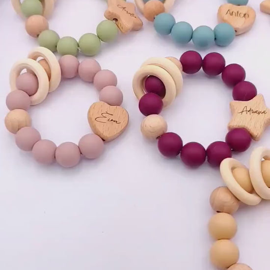 Personalisierter Baby Greifling aus Holz & Silikon – Montessori Greifling – Handgefertigtes Geschenk zur Geburt und Taufe
