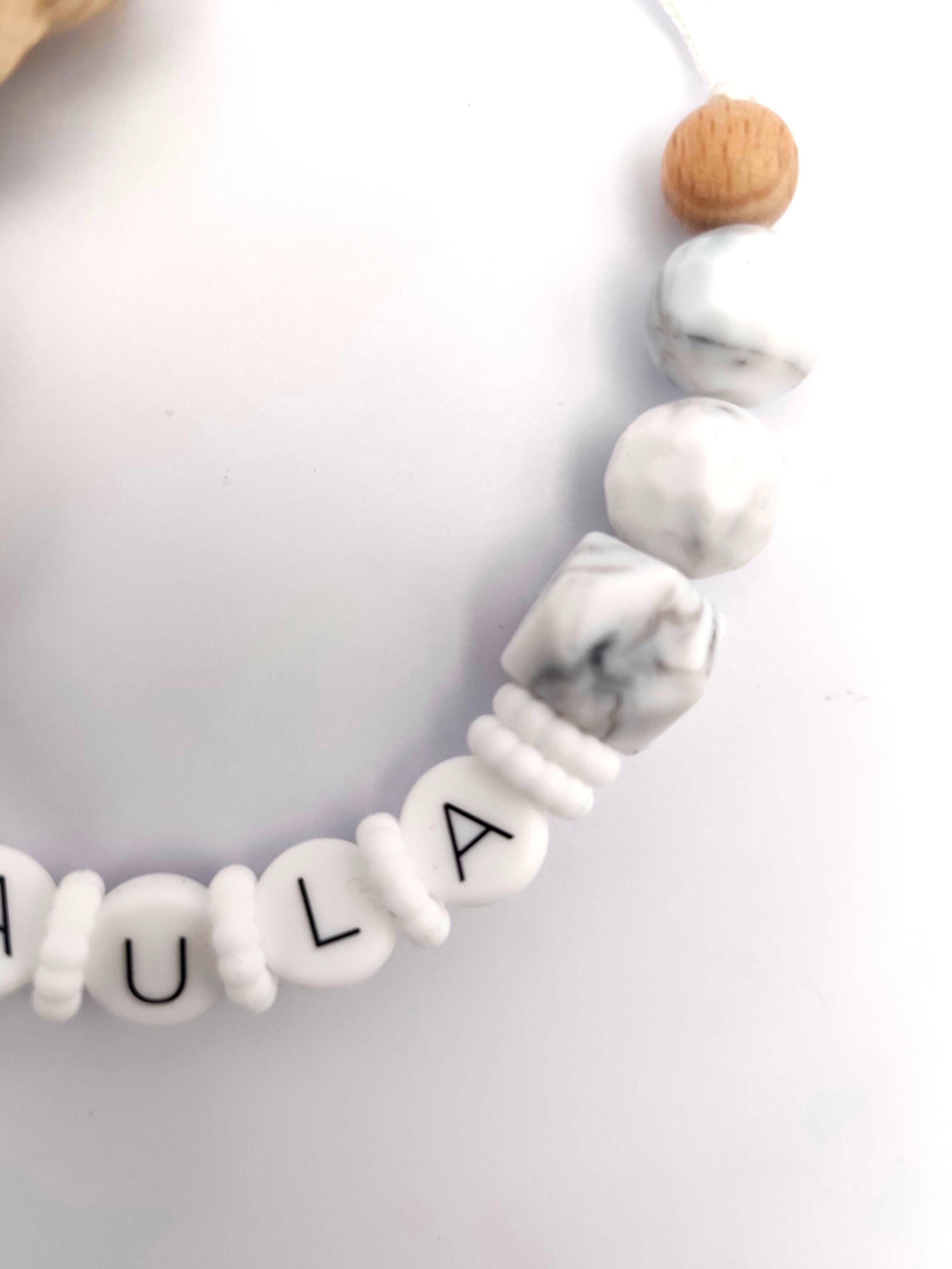 Personalisierte Schnullerkette mit weißen Silikonbuchstaben im edlen Marmor-Design ✨